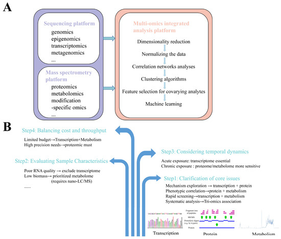 Multi-omics integrative analysis. (A) The general workflow for multi-omics integrative analysis. Sequencing platforms (genomics, epigenomics, transcriptomics, metagenomics) and mass spectrometry platforms (proteomics, metabolomics, modification-specific omics) feed into multi-omics integration featuring dimensionality reduction, data normalization, correlation networks, clustering algorithms, covariate-aware feature selection, and machine learning modeling. (B) Multi-omics selection strategies. Four-phase workflow: (1) core issue specification; (2) sample characteristic assessment; (3) temporal dynamics modeling (exposure duration/sampling intervals); (4) cost–throughput optimization (technology selection balancing resolution and resources).