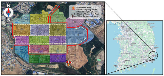 Meteorological conditions were monitored at the measurement sites using a wind sensor and mast system (WindSensor and Mast, FluxSense Co., Ltd., Stockholm, Sweden) installed in an unobstructed open area to minimize interference from nearby structures. For comparative analysis, three fixed reference sites were established. The upwind reference site was dynamically selected for each session based on the prevailing wind direction.