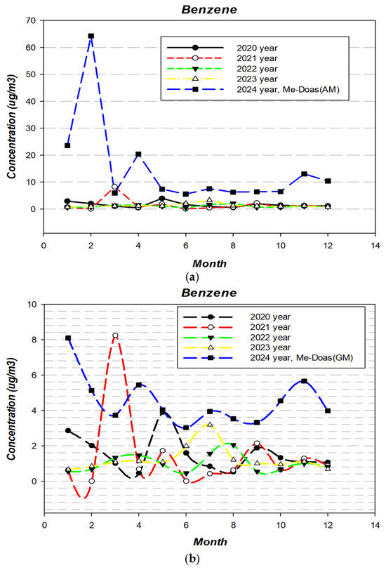 To further assess monthly variation, benzene data from a hazardous air pollutant monitoring station located approximately 1.4 km northeast of the study site were analyzed for the years 2020–2023 (Figure 5). The maximum and minimum monthly averages at the monitoring site were as follows.