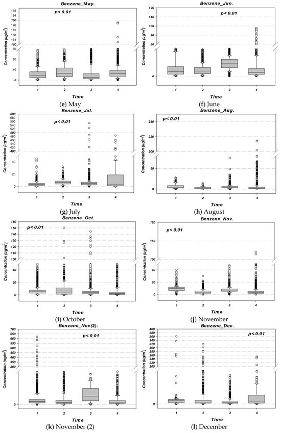 Benzene concentrations by time of day across different months in 2024 at the Ulsan Petrochemical Industrial Complex. The measurement periods were classified as follows: (1) morning (10:00–12:00); (2) afternoon (13:00–15:00); (3) nighttime (22:00–24:00); and (4) predawn hours (01:00–03:00 LT).