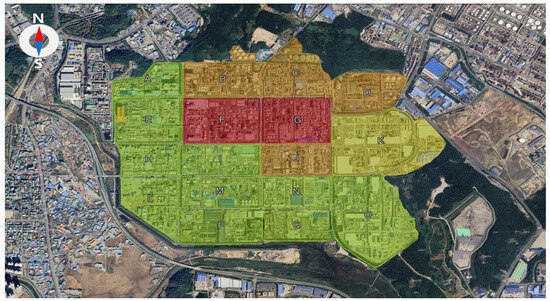 Detection frequency of high-concentration benzene “hot spots” in the Ulsan Petrochemical Industrial Complex. Blocks are color-coded by exceedance frequency of the 30 µg/m3 threshold: Red = >30 cases; Orange = 21–30 cases; Yellow = 11–20 cases; Green = ≤10 cases.