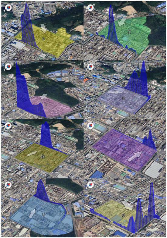 Figure 7 presents the number of exceedances of the benzene concentration threshold (30 µg/m3) at the Ulsan Petrochemical Industrial Complex. A total of 179 exceedance events were recorded during the measurement campaign. Among these, Block G exhibited the highest frequency, with 41 cases (23% of total), followed by Block F (32 cases), Block B (28 cases), Block J (25 cases), Block C (23 cases), Block D (25 cases), and Block K (14 cases).