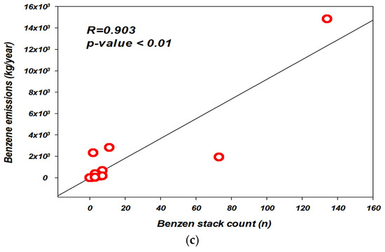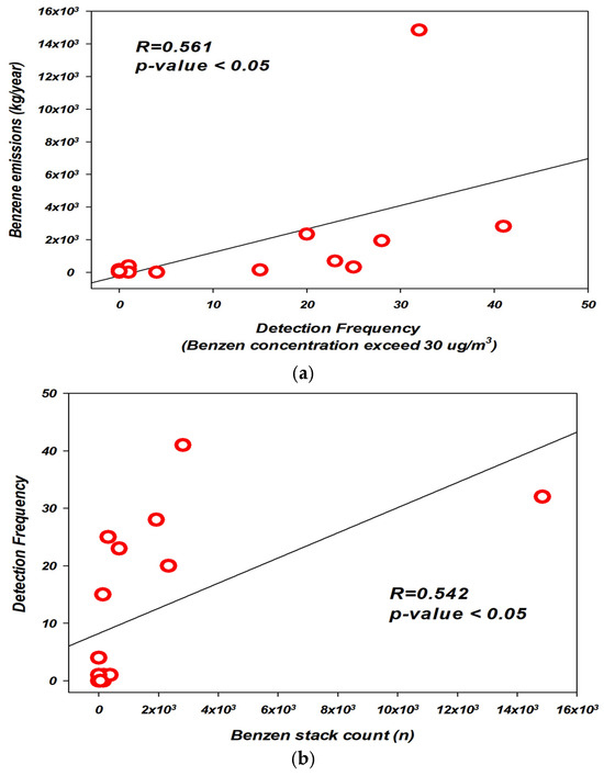 Figure 9 illustrates the results of a correlation analysis between the frequency of high-concentration benzene exceedances, total benzene emissions, and the number of stacks handling benzene. The results showed a weak but statistically significant correlation between exceedance frequency and total emissions (R = 0.561, p < 0.05), as well as between exceedance frequency and the number of benzene-handling stacks (R = 0.542, p < 0.05).