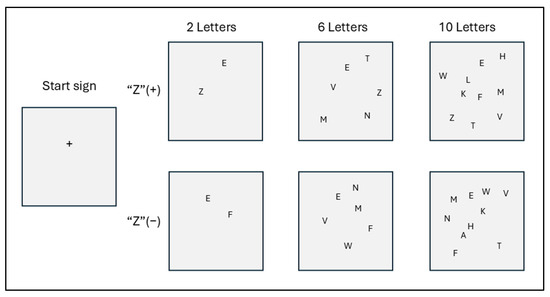 The visual stimuli on the computer screen displayed two, six, or ten letters. There were two variations of each: half included the target “Z,” and half did not. Each screen was displayed randomly ten times, resulting in a total of thirty visual stimulus tests. The purpose of these tests was to find the letter “Z” as quickly as possible on each screen.