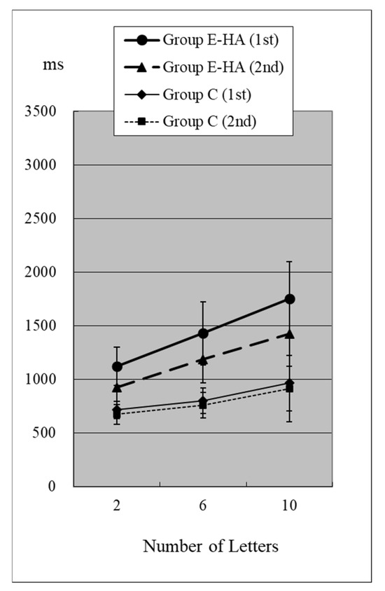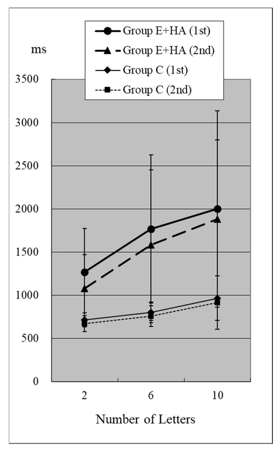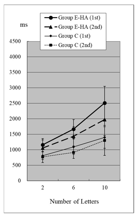 In Group C’s first test, RTs were 715 ± 81 ms (two letters), 803 ± 118 ms (six letters), and 967 ± 259 ms (ten letters), respectively (Figure 2, Table S1). As the number of presented letters increased, RTs increased significantly (Figure 2, Table S3). This phenomenon was observed in both the first and second tests, as well as in the test of Groups E-HA and E+HA (Figure 2 and Figure 3 and Table S3).