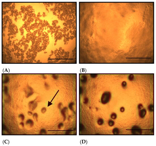 Morphological changes of D. discoideum on non-nutrient agar at different time points after seeding. (A): Immediately after inoculation, (B): 5 h after inoculation, (C): 10.5 h after inoculation, (D): 14 h after inoculation. The arrows indicate D. discoideum aggregates, which have a round outline. No aggregates were observed 5 h after inoculation, but aggregate formation was detected 10.5 h after inoculation. The number of aggregates increased 14 h after inoculation. Scale bars represent 0.5 mm.