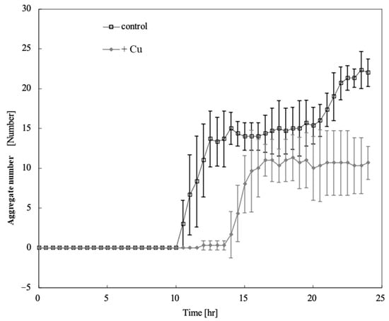 Time course of aggregate number changes on control and Cu-containing agar. Error bars indicate standard deviation. Squares and diamonds indicate the aggregate numbers under control and Cu-exposure conditions, respectively. Aggregates were detected 10.5 h after starvation in unexposed cells and 14 h after Cu exposure. Copper exposure delayed aggregate formation by 3.5 h and reduced the number of aggregates.