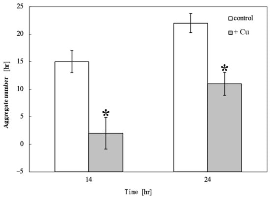 Comparison of aggregate numbers at 14 and 24 h with and without Cu exposure. Asterisks “*” indicate a significant difference in the number of D. discoideum aggregates between the Cu-exposed and unexposed conditions, as determined by t-test (p < 0.05). There was a significant difference in the reduction in the number of D. discoideum aggregates between Cu-exposed and unexposed conditions both 14 and 24 h after inoculation.