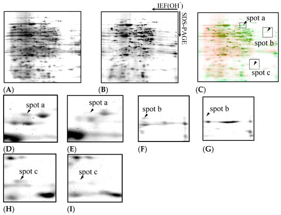 Two-dimensional gel electrophoresis images of D. discoideum proteins. The samples were treated with TCA, extracted with a protein-solubilising solution containing urea, separated by immobilised pH gradient two-dimensional electrophoresis combining IEF and SDS-PAGE, and then silver stained. (A): Control, (B): Cu exposure. Expression of 280 proteins was detected under both copper exposure and non-exposure conditions. The spots in the electrophoretic diagram obtained from D. discoideum were coloured green for those exposed to Cu and red for those not exposed, and the spots were overlaid to compare the expression levels (C). Cu exposure caused expression of spot a, spot b, and spot c to disappear. Panels (D–I) show magnified views of spots a to c, as indicated in panel C. Spots a, b, and c detected in the control group (panel D,F,H) are absent under the Cu exposure condition (panel E,G,I).