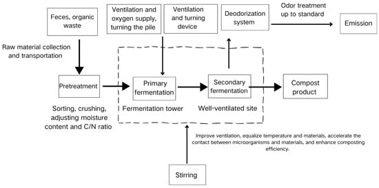 Figure 2 shows the composting process flow. Firstly, raw materials were collected and transported. Manure and organic waste were pre-treated, including sorting, crushing, adjusting the moisture content, and the carbon-to-nitrogen ratio (C/N ratio). Then it entered the primary fermentation stage, which took place in a fermentation tower. During this period, ventilation for oxygen supply and turning of the pile were required. Next was the secondary fermentation, which was carried out in a well-ventilated site. Stirring operations were carried out during both fermentation stages to improve ventilation, balance the temperature and materials, accelerate the contact between microorganisms and materials, and improve composting efficiency. After that, deodorization treatment was carried out through a deodorization device. The gas was discharged after the odor met the standard, and finally, the compost product was obtained.