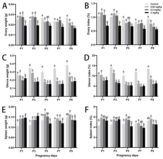 Effects of DES treatment on organ development and organ coefficients in pregnant mice. (A,B) Ovary weight and ovary coefficient. (C,D) Uterus weight and uterus coefficient. (E,F) Spleen weight and spleen coefficient. Groups labeled with different superscript letters exhibit significant differences (p < 0.05); the same letter indicates no significant difference (p > 0.05). Data are reported as mean ± SD.