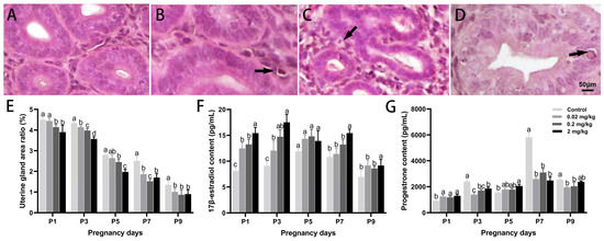 Effects of DES treatment on the histological structure of uterine glandular epithelium and serum hormone levels in pregnant mice. (A–D) Representative images of the control, 0.02 mg/kg, 0.2 mg/kg, and 2 mg/kg groups, respectively. Scale bar = 50 µm. Arrows indicate vacuolated cells. (E) Percentage of uterine gland area relative to the total uterine area. (F) Serum levels of 17β-estradiol. (G) Serum levels of progesterone. Groups labeled with different superscript letters exhibit significant differences (p < 0.05); the same letter indicates no significant difference (p > 0.05). Data are reported as mean ± SD.