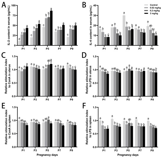 Effects of DES treatment on peripheral blood cytokines and lymphocyte proliferation in pregnant mice. (A,B) IL-2 and IL-4 concentrations in peripheral blood. (C,D) Proliferative responses of uterine lymphocytes to Con A and LPS. (E,F) Proliferative responses of splenic lymphocytes to Con A and LPS. Groups labeled with different superscript letters exhibit significant differences (p < 0.05); the same letter indicates no significant difference (p > 0.05). Data are reported as mean ± SD.