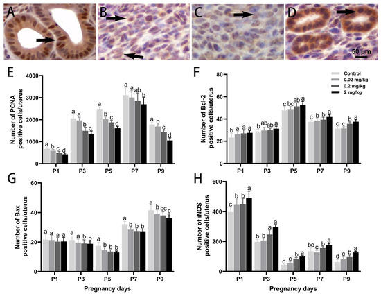 Effects of DES treatment on the expression of PCNA, Bcl-2, Bax, and iNOS in the uterine glandular epithelium of pregnant mice. (A,E) PCNA expression. (B,F) Bcl-2 expression. (C,G) Bax expression. (D,H) iNOS expression. Arrows point to cells showing positive immunostaining. Scale bar = 50 µm. Groups labeled with different superscript letters exhibit significant differences (p < 0.05); the same letter indicates no significant difference (p > 0.05). Data are reported as mean ± SD.