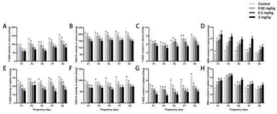 Effects of DES treatment on uterine and splenic antioxidant status in pregnant mice. (A–D) Activities of T-SOD, GSH-Px, T-AOC, and MDA in the uterus. (E–H) Activities of T-SOD, GSH-Px, T-AOC, and MDA in the spleen. Groups labeled with different superscript letters exhibit significant differences (p < 0.05); the same letter indicates no significant difference (p > 0.05). Data are reported as mean ± SD.