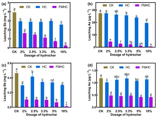 Stabilization of Sb and As in soil by HC and FMHC. Water leaching Sb (a) and As (b) in Soil#1. Water leaching Sb (c) and As (d) in Soil#2. CK represents the soils without amendment. Different lowercase letters indicate significant differences between groups (p < 0.05).
