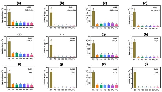 Leaching toxicity of antimony and arsenic in soil. HNO3-H2SO4 leaching Sb (a) and As (b) in Soil#1. HNO3-H2SO4 leaching Sb (c) and As (d) in Soil#2. Water leaching Sb (e) and As (f) in Soil#1. Water leaching Sb (g) and As (h) in Soil#2. TCLP leaching Sb (i) and As (j) in Soil#1. TCLP leaching Sb (k) and As (l) in Soil#2. CK represents untreated control soil samples without amendment. Samples labeled 7d, 15d, 30d, and 60d denote specimens amended with 5% FMHC and cured for 7, 15, 30, and 60 days, respectively, under natural conditions. DW30 and FT30 indicate modified soil samples subjected to environmental stress testing through 30 cycles of alternate wet–dry conditions and freeze–thaw treatments, respectively. Different lowercase letters indicate significant differences between groups (p < 0.05).