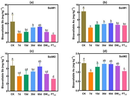 Bioavailability of antimony and arsenic in soil: Na2HPO4 extraction. Bioavailable Sb (a) and As (b) in Soil#1. Bioavailable Sb (c) and As (d) in Soil#2. CK represents untreated control soil samples without amendment. Samples labeled 7d, 15d, 30d, and 60d denote specimens amended with 5% FMHC and cured for 7, 15, 30, and 60 days, respectively, under natural conditions. DW30 and FT30 indicate modified soil samples subjected to environmental stress testing through 30 cycles of alternate wet–dry conditions and freeze–thaw treatments, respectively. Different lowercase letters indicate significant differences between groups (p < 0.05).
