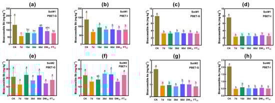 Bioaccessibility of antimony and arsenic in soil: PBET extraction. Gastric phase (PBET-G) extracted Sb (a) and As (c) in Soil#1, and Sb (e) and As (g) in Soil#2. Intestinal phase (PBET-I) extracted Sb (b) and As (d) in Soil#1, and Sb (f) and As (h) in Soil#2. CK represents untreated control soil samples without amendment. Samples labeled 7d, 15d, 30d, and 60d denote specimens amended with 5% FMHC and cured for 7, 15, 30, and 60 days, respectively, under natural conditions. DW30 and FT30 indicate modified soil samples subjected to environmental stress testing through 30 cycles of alternate wet–dry conditions and freeze–thaw treatments, respectively. Different lowercase letters indicate significant differences between groups (p < 0.05).
