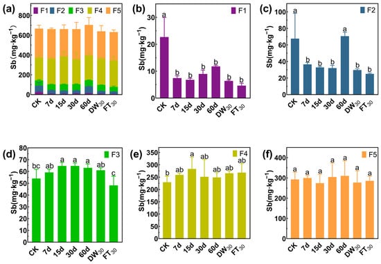 Formation of antimony in Soil#2: Wenzel extraction. (a) Column chart of Sb speciation distribution in soil; Concentration changes of F1 (b), F2 (c), F3 (d), F4 (e) and F5 (f) fraction Sb. CK represents untreated control soil samples without amendment. Samples labeled 7d, 15d, 30d, and 60d denote specimens amended with 5% FMHC and cured for 7, 15, 30, and 60 days, respectively, under natural conditions. DW30 and FT30 indicate modified soil samples subjected to environmental stress testing through 30 cycles of alternate wet–dry conditions and freeze–thaw treatments, respectively. The five chemical fractions of antimony are operationally defined as follows: F1: non-specifically sorbed (easily mobilizable, outer-sphere complexes); F2: specifically sorbed (readily mobilizable, inner-sphere complexes); F3: amorphous to poorly crystalline Fe/Al hydrous oxide-bound fraction; F4: well-crystallized Fe/Al hydrous oxide-bound fraction; and F5: residual fraction. Different lowercase letters indicate significant differences between groups (p < 0.05).