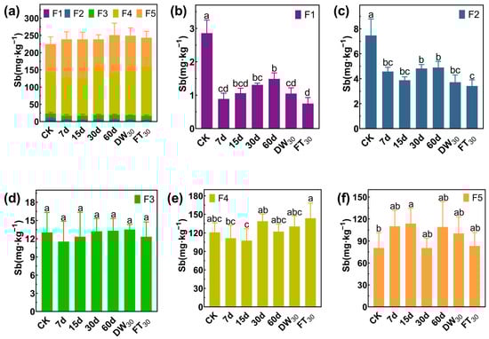 Formation of antimony in Soil#1: Wenzel extraction. (a) Column chart of Sb speciation distribution in soil; Concentration changes of F1 (b), F2 (c), F3 (d), F4 (e) and F5 (f) fraction Sb. CK represents untreated control soil samples without amendment. Samples labeled 7d, 15d, 30d, and 60d denote specimens amended with 5% FMHC and cured for 7, 15, 30, and 60 days, respectively, under natural conditions. DW30 and FT30 indicate modified soil samples subjected to environmental stress testing through 30 cycles of alternate wet–dry conditions and freeze–thaw treatments, respectively. The five chemical fractions of antimony are operationally defined as follows: F1: non-specifically sorbed (easily mobilizable, outer-sphere complexes); F2: specifically sorbed (readily mobilizable, inner-sphere complexes); F3: amorphous to poorly crystalline Fe/Al hydrous oxide-bound fraction; F4: well-crystallized Fe/Al hydrous oxide-bound fraction; and F5: residual fraction. Different lowercase letters indicate significant differences between groups (p < 0.05).