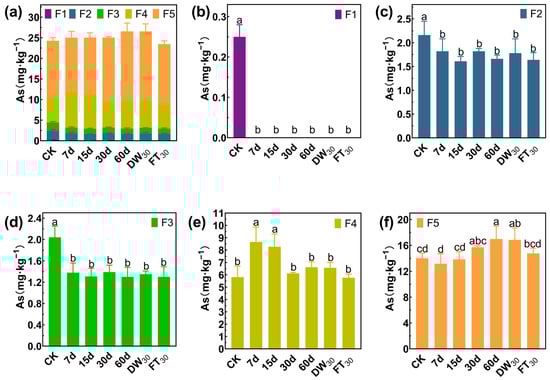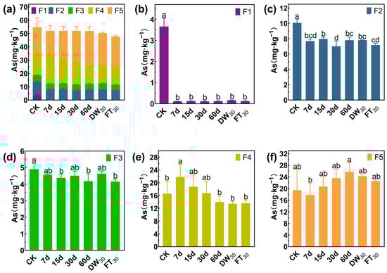 Formation of arsenic in Soil#1: Wenzel extraction. (a) Column chart of As speciation distribution in soil; Concentration changes of F1 (b), F2 (c), F3 (d), F4 (e) and F5 (f) fraction As. CK represents untreated control soil samples without amendment. Samples labeled 7d, 15d, 30d, and 60d denote specimens amended with 5% FMHC and cured for 7, 15, 30, and 60 days, respectively, under natural conditions. DW30 and FT30 indicate modified soil samples subjected to environmental stress testing through 30 cycles of alternate wet–dry conditions and freeze–thaw treatments, respectively. The five chemical fractions of arsenic are operationally defined as follows: F1: non-specifically sorbed (easily mobilizable, outer-sphere complexes); F2: specifically sorbed (readily mobilizable, inner-sphere complexes); F3: amorphous to poorly crystalline Fe/Al hydrous oxide-bound fraction; F4: well-crystallized Fe/Al hydrous oxide-bound fraction; and F5: residual fraction. Different lowercase letters indicate significant differences between groups (p < 0.05).