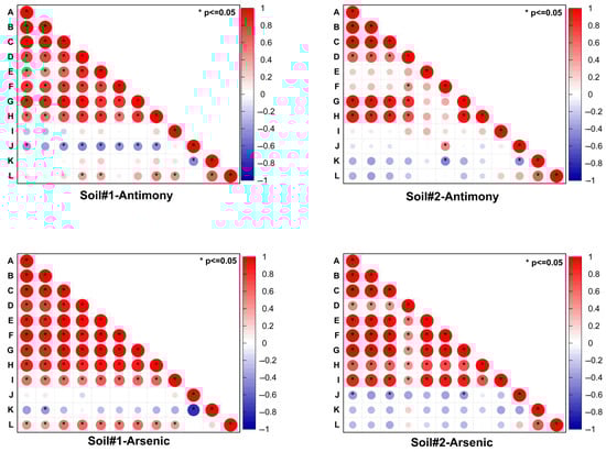 Correlation heatmap of Sb/As concentrations in soils extracted using different methods. Letters A-L represent concentrations of Sb/As extracted via different methods: (A) HNO3-H2SO4 extraction, (B) water extraction, (C) TCLP extraction, (D) bioavailable concentration, (E) PBET-simulated gastric phase extraction, (F) PBET-simulated intestinal phase extraction, (G) F1 fraction (non-specifically sorbed), (H) F2 fraction (specifically sorbed), (I) F3 fraction (amorphous to poorly crystalline Fe/Al hydrous oxide-bound), (J) F4 fraction (well-crystallized Fe/Al hydrous oxide-bound), (K) F5 fraction (residual), and (L) total concentration. Circle size and color intensity both correspond to correlation coefficient magnitude (see color scale). Asterisks (*) denote statistical significance (p < 0.05).