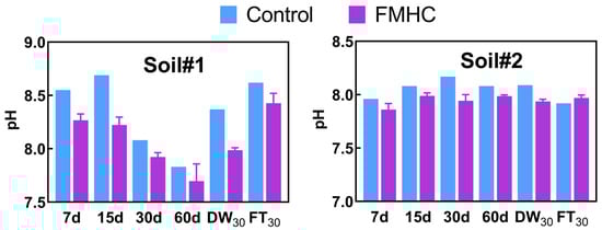 pH of Soil#1 and Soil#2. Control represents untreated control soil samples without amendment, while FMHC represents soils amended with 5% FMHC. 7d, 15d, 30d, and 60d represent soil samples cured for 7, 15, 30, and 60 days, respectively, under natural conditions. DW30 and FT30 indicate soil samples subjected to environmental stress testing through 30 cycles of alternate wet–dry conditions and freeze–thaw treatments, respectively.
