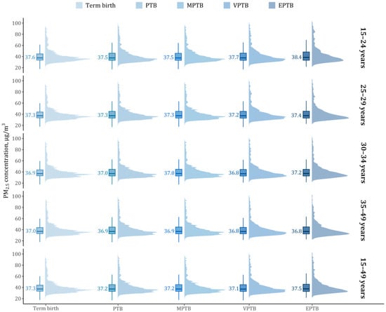 Boxplots and kernel density curves of age-specific PM2.5 exposure in term births and PTB outcomes. Abbreviations: PTB, preterm birth; MPTB, moderate to late preterm birth; VPTB, very preterm birth; EPTB, extremely preterm birth; PM2.5, fine particulate matter.