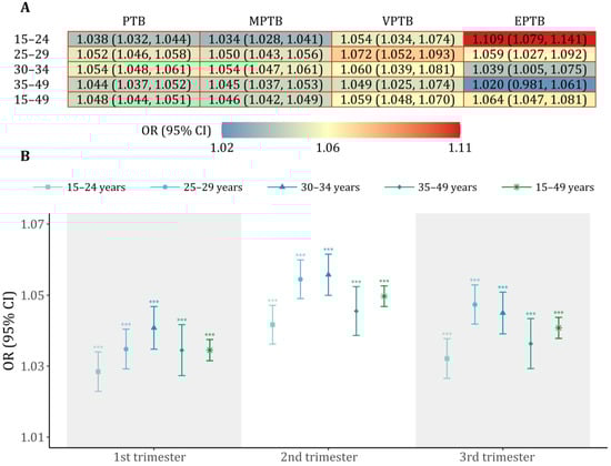 Age-specific odds ratio of PTB outcomes associated with a 10 μg/m3 increase in PM2.5 exposure throughout the entire pregnancy (A) and each trimester (B). Note: *** indicates statistical significance. Abbreviations: OR, odds ratio; CI, confidence interval; PTB, preterm birth; MPTB, moderate to late preterm birth; VPTB, very preterm birth; EPTB, extremely preterm birth.