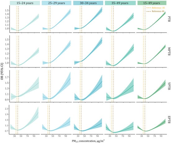 Exposure–response associations of PM2.5 exposure during the entire pregnancy with various PTB outcomes, stratified by maternal age. The vertical dashed lines indicate reference PM2.5 concentrations of 35 μg/m3 and 40 μg/m3. Abbreviations: OR, odds ratio; CI, confidence interval; PM2.5, fine particulate matter; PTB, preterm birth; MPTB, moderate to late preterm birth; VPTB, very preterm birth; EPTB, extremely preterm birth.