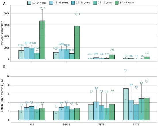 Estimates of avoidable PTB burden by achieving WHO’s IT1 for annual PM2.5 concentration in Iran during 2013–2018: (A) estimated number of avoidable cases; (B) attributable fraction. Abbreviations: PTB, preterm birth; MPTB, moderate to late preterm birth; VPTB, very preterm birth; EPTB, extremely preterm birth; PM2.5, fine particulate matter; WHO, World Health Organization; IT, interim target.
