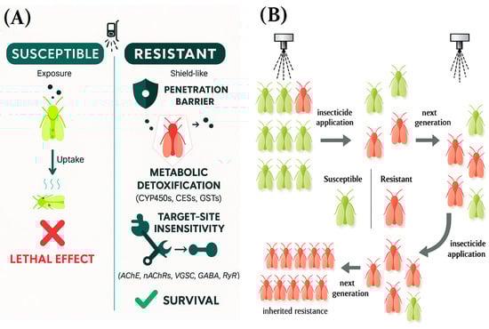 Conceptual illustration of insecticide resistance in insects. (A) The diagram contrasts insecticide-susceptible insects (left) with insecticide-resistant insects (right). Susceptible individuals are killed upon exposure to insecticides, whereas resistant individuals possess one or more adaptive mechanisms that enable survival. These mechanisms include reduced cuticular penetration (limiting insecticide entry), enhanced metabolic detoxification, and target-site insensitivity (e.g., mutations at the insecticide’s site of action). (B) Insecticide resistance emerges when these adaptive traits allow certain individuals to survive exposure to otherwise lethal doses, resulting in the selection, persistence, and eventual spread of resistant populations.