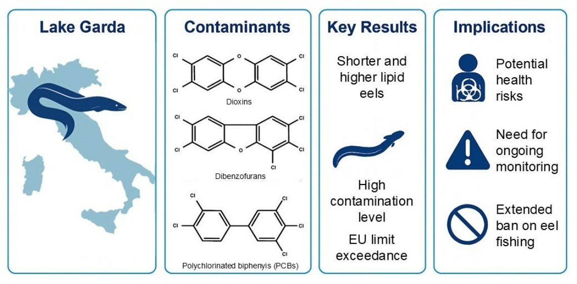 These findings raise concerns about the safety of consumption of eels from this region and support the continuation of the ban on eel fishing in Lake Garda. Future research should consider integrating broader environmental and ecological variables to improve predictive accuracy and deepen understanding of contaminant dynamics in aquatic ecosystems.