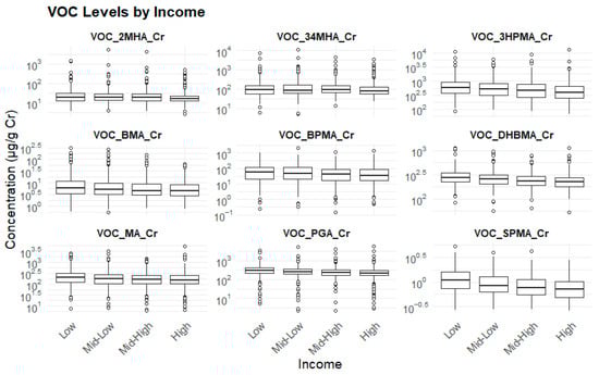 Significantly higher concentrations of 3HPMA, SPMA, and DHBMA were observed among participants with low household income levels (p < 0.05) (Table 6) (Figure 4).