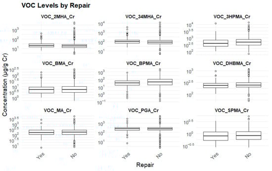 Participants who had completed home renovations within the previous 6 months demonstrated significantly higher concentrations of 3HPMA and DHBMA (p < 0.05), suggesting potential exposure to VOCs from building materials or modifications in the indoor environment (Table 8) (Figure 6).