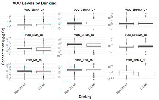 Urinary VOC metabolites were quantified using LC–MS/MS with isotope-labeled internal standards, following KNHANES laboratory guidelines. Accuracy was evaluated by comparing measured concentrations to reference values, calculating percent accuracy, and ensuring coefficients of variation (CV) met acceptance limits. Internal QC included daily verification of instrument performance, calibration, and accuracy checks, while external QC was conducted annually through participation in the German External Quality Assessment Scheme (G-EQUAS) to confirm validity. Re-analysis was performed when acceptance criteria were not met, such as abnormal peak patterns, deviations in internal standard responses, or sample preparation errors. These procedures ensured high precision, accuracy, and reproducibility of VOC metabolite measurements [].
