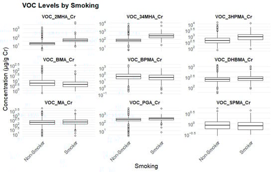 - Hu, Y.; Niu, Z.; Cao, C.; Gao, J.; Pan, M.; Cai, Y.; Zhao, Z. Volatile organic compounds (VOC) metabolites in urine are associated with increased systemic inflammation levels, and smokers are identified as a vulnerable population. Ecotoxicol. Environ. Saf. 2024, 288, 117398. [Google Scholar] [CrossRef]