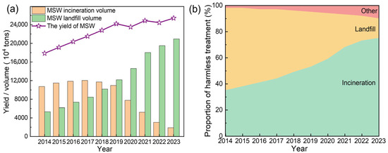 Trends in the total volume and treatment of MSW in China from 2014 to 2023. (a) Changes in the yield, incineration, and landfilling of MSW in China. (b) Proportions of MSW undergoing harmless treatment (including incineration, landfilling, and other methods).
