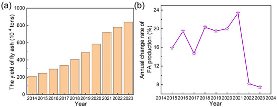 (a) The yield of MSWI FA and (b) annual change rate of FA production from 2014 to 2023.