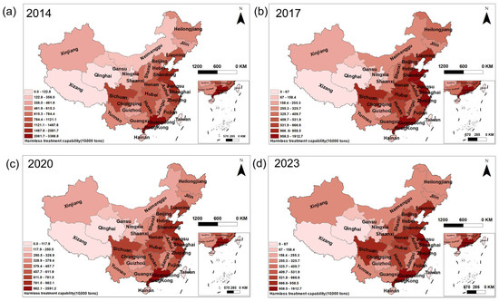 MSW collection volumes across provinces in China. (a) 2014, (b) 2017, (c) 2020, and (d) 2023.