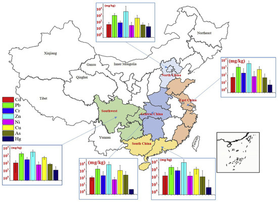 Geometric mean values of heavy metal concentrations in MSWI FA from different regions of China, reproduced from [46]. 2019, Environ Pollut.