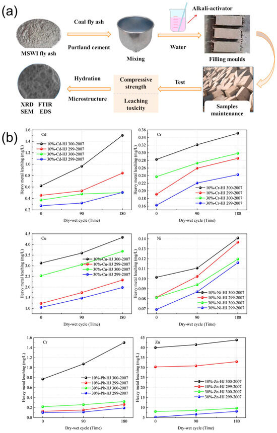 (a) Mechanism of stabilization of MSWI FA [61]. 2021, J. Clean. Prod. (b) Heavy metal leaching of incineration FA, reproduced from [64]. 2025, Langmuir.