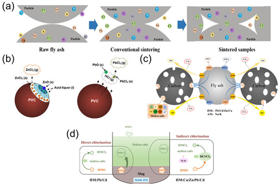 Mechanistic pathways of heavy metal transformation during thermal processes. (a) Conventional sintering, reproduced from [79]. 2021. Waste Manag. (b) Chlorination-induced migration, reproduced from [70]. 2023, Chem. Eng. J. (c) Co-reduction treatment, reproduced from [80]. 2020, Resour. Conserv. Recycl. (d) Molten salts thermal treatment, reproduced from [81]. 2020, Waste Manag.