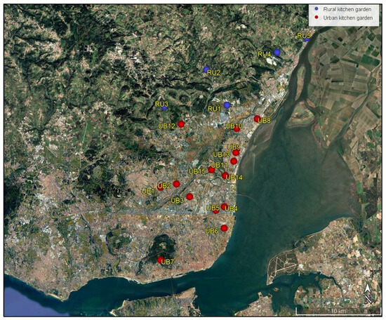 Nevertheless, urban gardens also have environmental risks which can harm human health. Soil contamination by potentially toxic elements (e.g., Pb, Cd, Cr, Ni, Zn) is one of the main concerns since these often accumulate in urban soils, due to long-term deposition from vehicle traffic, industrial emissions, and multiple other sources. Human exposure (with several possible transmission pathways) to these soil contaminants can occur through ingestion of home-grown produce, inhalation of resuspended soil particles, or direct contact with soil during gardening. Several studies have found PTE concentrations in urban garden soils often at toxic levels, posing potential risks for human health, namely for more vulnerable groups [29]. To address this issue, we evaluated soil fertility and PTE contamination in kitchen gardens (also designated as community gardens or allotment gardens) across urban Lisbon, Portugal, using rural kitchen gardens as a baseline for comparison. Our study addresses a critical knowledge gap regarding PTE contamination in Lisbon’s urban kitchen gardens. It contributes to clarifying the extent of PTE enrichment in these soils and associated exposure risks for local gardeners, providing evidence to inform public health guidelines, urban food policies, and environmental planning decisions for safer and more sustainable urban gardening.