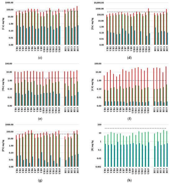 Distribution of total (red), pseudo-total (green) and available (blue) contents of (a) Cr; (b) Ni; (c) Cu, (d) Zn; (e) Mo; (f) Cd; (g) Pb and (h) B of soils collected from kitchen gardens in urban and rural areas of the northern Lisbon metropolitan area. The data are presented on a logarithmic scale. The black dashed line represents the value of Portuguese soil legislation for each element [44].