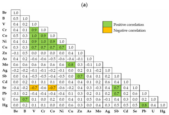 Spearman correlation matrix for studied metals and metalloids considering the soils collected from kitchen gardens in urban (a) and rural (b) areas of the northern Lisbon metropolitan area.