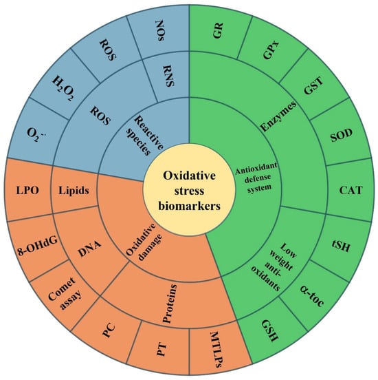 Biomarkers of oxidative stress are divided by typology: reactive species, the antioxidant defense system, and oxidative damage. 8-OHdG: 8-hydroxy-2′-deoxyguanosine; α-toc: alpha-tocopherol; CAT: catalase; GPx: glutathione peroxidase; GR: glutathione reductase; GSH: reduced glutathione; GST: glutathione-S-transferase; LPO: lipid peroxidation; MTLPs: metallothionein-like proteins; PC: protein carbonyl; PT: protein thiol; SOD: superoxide dismutase; tSH: total thiols.