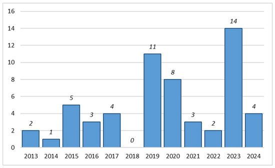Figure 2 shows the total number of articles by year. The year with the highest number of publications was 2023, with 14 articles (23%), and the year with the lowest number of publications was 2018, with zero articles. The distribution of papers over the years appeared well balanced, although with some fluctuations. Many studies have demonstrated that studying oxidative stress in insects is relevant and evolving.