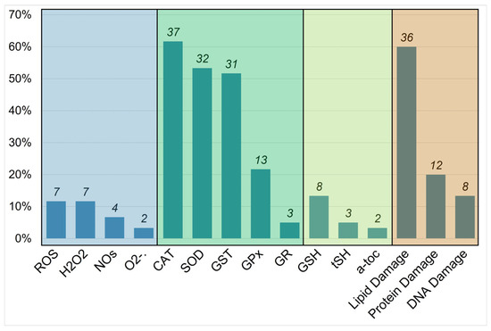 Figure 3 shows the percentages of articles that used oxidative stress assays. Most articles used CAT and lipid damage assays (65 and 63% of articles, respectively), whereas 56 and 54% of the articles used SOD and GST assays. Catalase and SOD are antioxidant enzymes that are commonly studied together because they work simultaneously. In particular, SOD is a catalyst for the dismutation of O2·− into H2O2, and CAT can eliminate H2O2, catalyzing the transfer of electrons [11]. As described in the following sections, CAT and SOD are very straightforward and practical tests that involve the evaluation of oxidative stress via UV-vis spectrophotometric analysis of the decrease in the absorbance signal of H2O2. Lipid damage may be associated with depletion of the antioxidant activity of SOD, CAT, and GST [36]. Methods using these latter assays will also be described in the following sections.